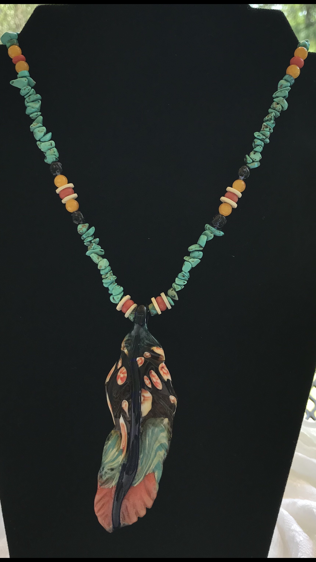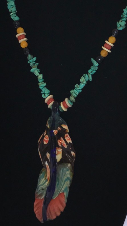 Vintage coral, heishi, blue spotted glass and citrine bead accents draw attention to this borosiliate feather on natural turquoise colored stones. A playful mix of mottled colors and milifiori make this a unique feather for change, ideas and an immagination to soar.