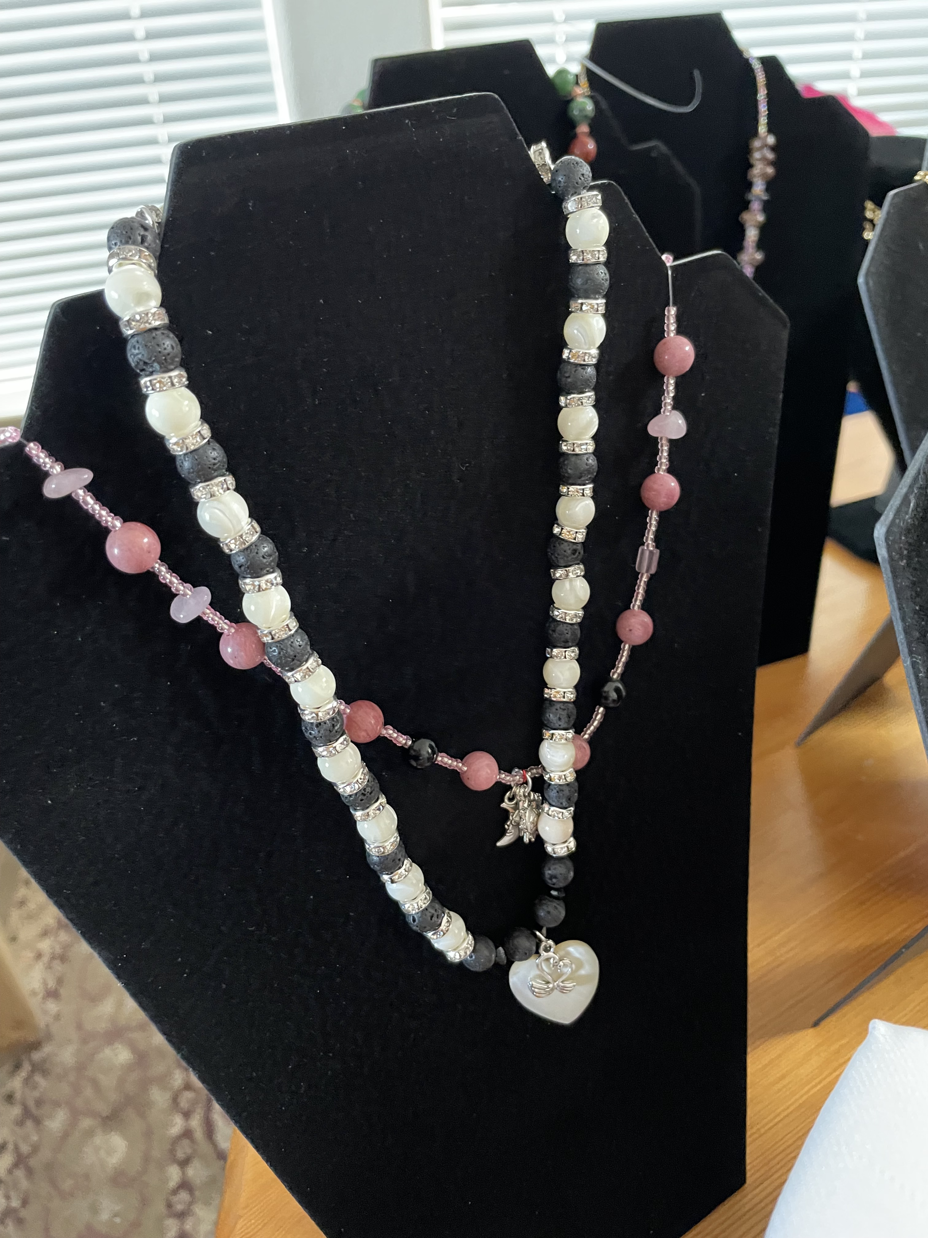 Vintage Mother of Pearl heart pendant and rounds with lava beads and silver silver colored diamond-studded spacers. $10.00